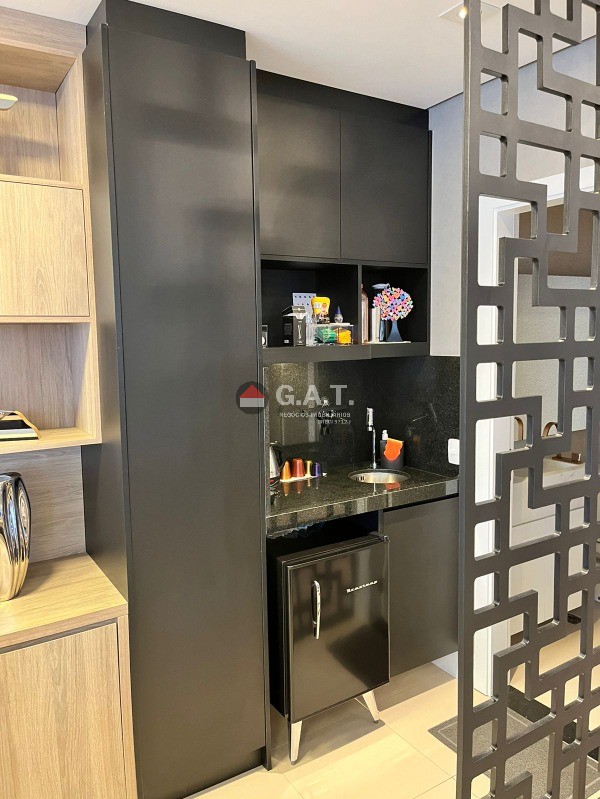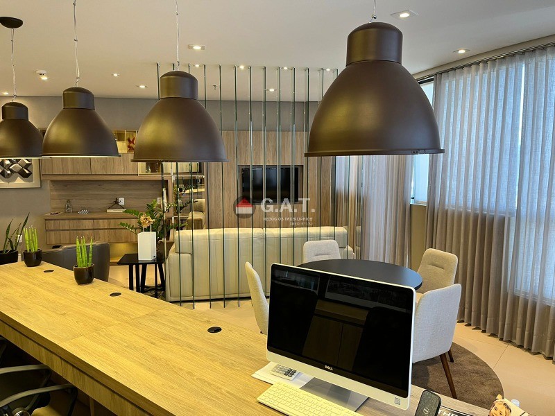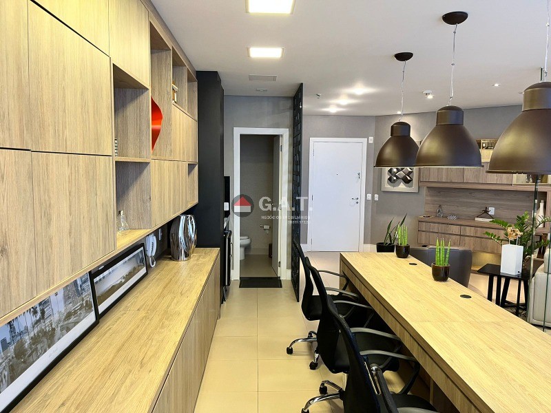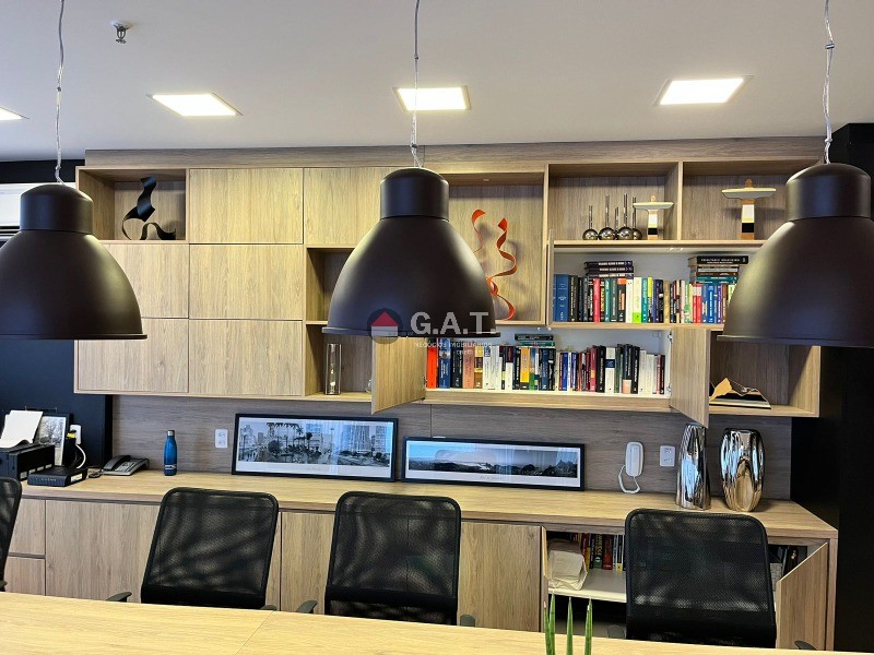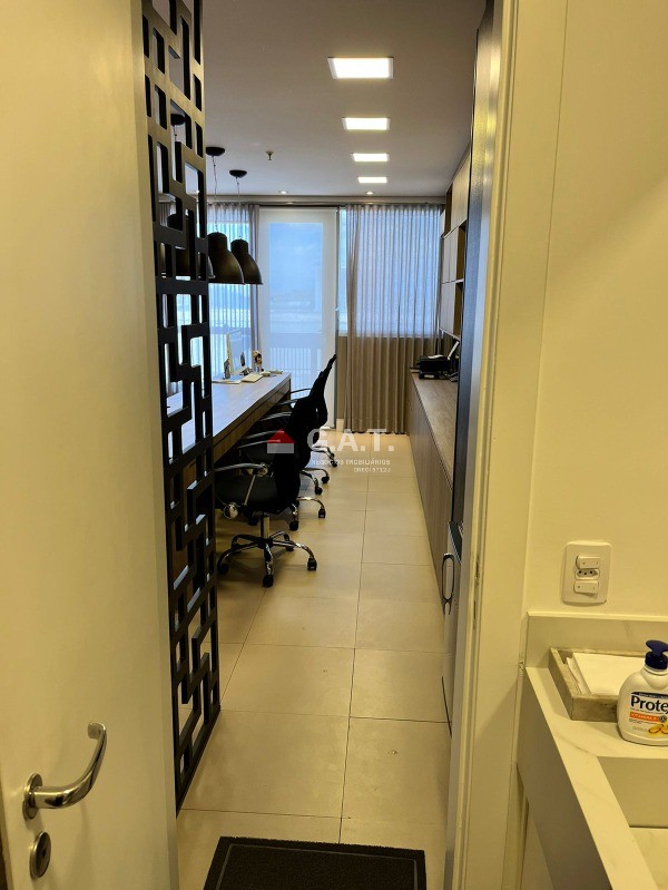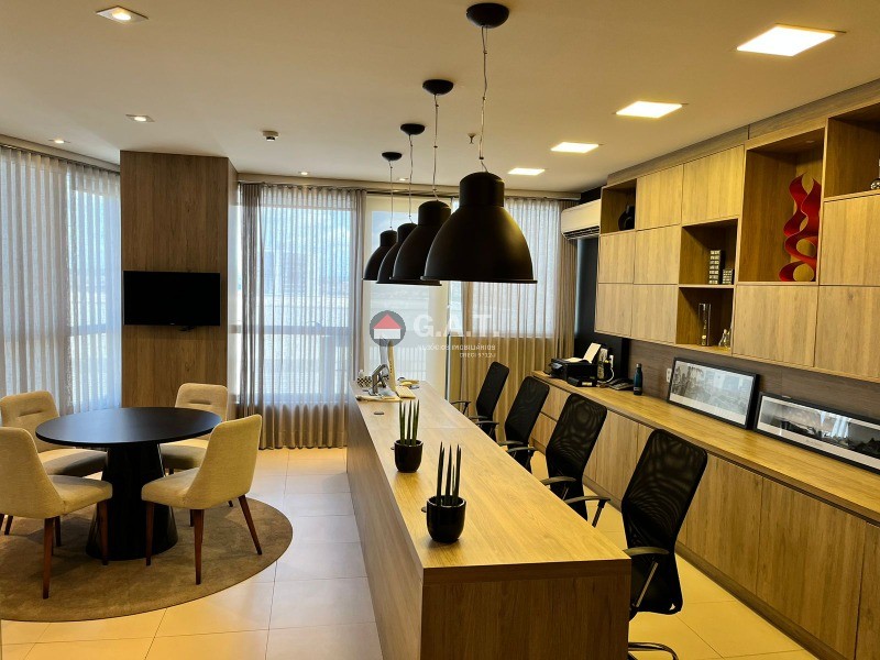 Sala comercial com 56m² de esquina totalmente mobiliada; Frigobar; Copa; 2 TVs; 2 Poltronas em couro; Bancada; Móveis modulados; Mesa de reunião 4 lugares; Divisória em vidro; Cortinas de linho com forro em blakout; Luminárias em led; Lavabo decorado com metais moderno e bancada em mármore travertino; Modulados todeschini; Sacada; Piso frio  REF:SL03324